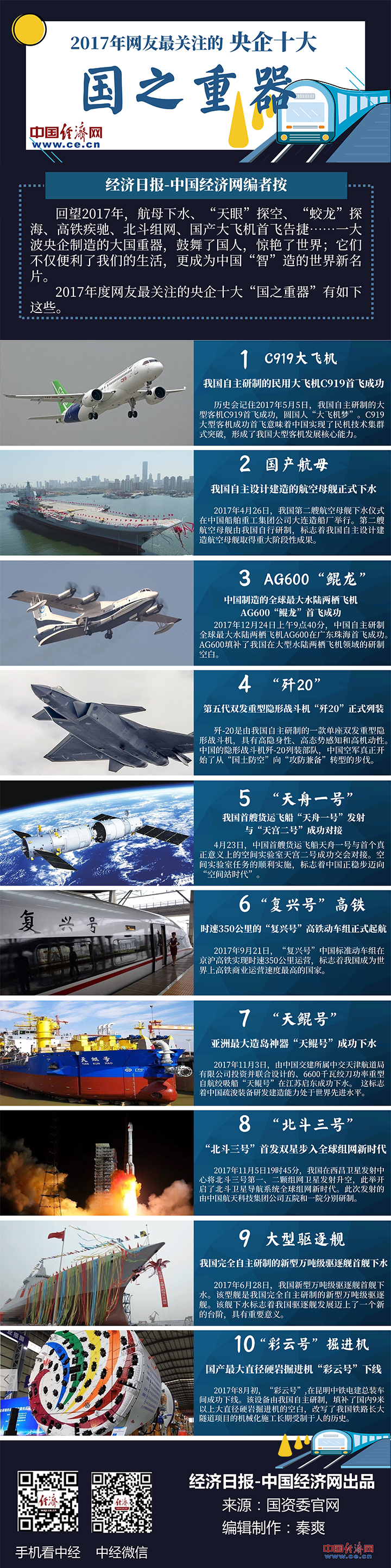 經(jīng)濟(jì)日?qǐng)?bào)-中國(guó)經(jīng)濟(jì)網(wǎng)編者按:回望2017年,航母下水、“天眼”探空、“蛟龍”探海、高鐵疾馳、北斗組網(wǎng)、國(guó)產(chǎn)大飛機(jī)首飛告捷……一大波央企制造的大國(guó)重器,鼓舞了國(guó)人,驚艷了世界;它們不僅便利了我們的生活,更成為中國(guó)“智”造的世界新名片。