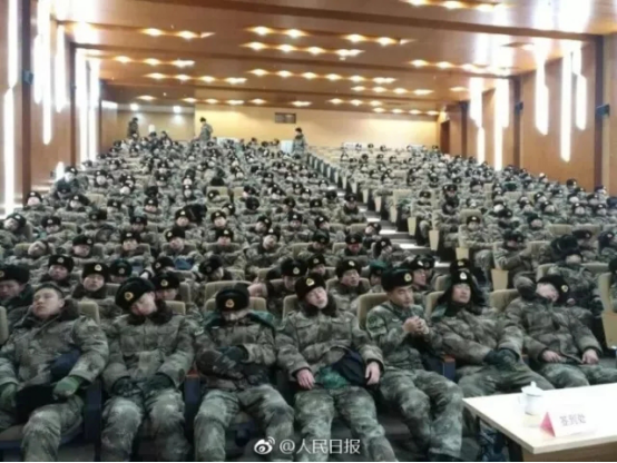 這張照片攝于南京建鄴區文化藝術中心小劇場,26日清晨,某舟橋旅官兵540余人,結束徹夜掃雪除冰任務后,在此休息。他們中絕大部分是90后、95后。
