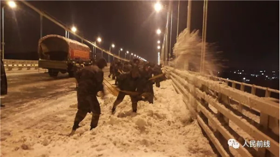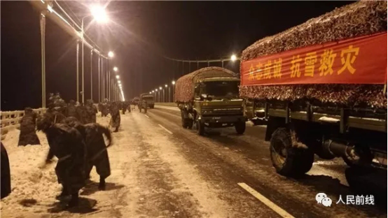 1月25日晚開始,東部戰區和江蘇省軍區緊急派出官兵,奔赴駐地掃雪除冰、清理道路,保障人民出行安全。