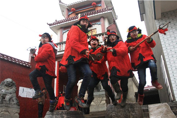 孩子們頭戴長巾,身穿“五猖服”,臉涂紅、白、黑三色,手握鋼叉,號稱“五猖兵馬”,象征正義之神。早飯后,開始第一次巡邏,大人們鳴鑼擊鼓,“五猖兵馬”在各家各戶之間往來呼喚,驅趕“狐貍夜貓”,好不熱鬧!