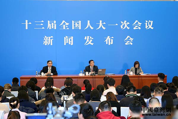 十三屆全國(guó)人大一次會(huì)議舉行新聞發(fā)布會(huì),發(fā)言人張業(yè)遂向中外媒體介紹本次大會(huì)有關(guān)情況并回答記者提問(wèn)。(中國(guó)臺(tái)灣網(wǎng) 何建峰 攝)