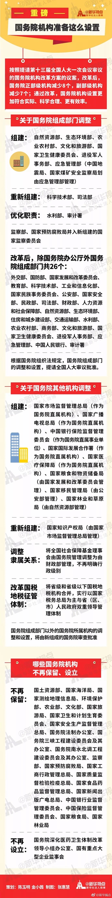 按照提請第十三屆全國人大一次會議審議的《國務院機構改革方案》,改革后,國務院正部級機構減少8個,副部級機構減少7個。具體改革方案請看長圖: