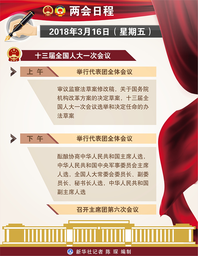 新華社北京3月15日電 十三屆全國(guó)人大一次會(huì)議16日全天舉行代表團(tuán)全體會(huì)議,上午審議監(jiān)察法草案修改稿,關(guān)于國(guó)務(wù)院機(jī)構(gòu)改革方案的決定草案,十三屆全國(guó)人大一次會(huì)議選舉和決定任命的辦法草案;下午醞釀協(xié)商中華人民共和國(guó)主席人選,中華人民共和國(guó)中央軍事委員會(huì)主席人選,全國(guó)人大常委會(huì)委員長(zhǎng)、副委員長(zhǎng)、秘書長(zhǎng)人選,中華人民共和國(guó)副主席人選。下午,召開主席團(tuán)第六次會(huì)議。