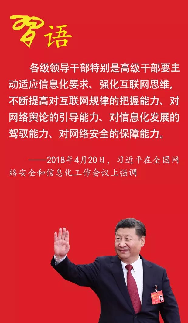 全國網絡安全和信息化工作會議20日至21日在北京召開。習近平總書記出席會議并發表重要講話。在此次會議上,總書記就建設網絡強國,對領導干部強調“各級領導干部特別是高級干部要主動適應信息化要求、強化互聯網思維”,“不斷提高對互聯網規律的把握能力、對網絡輿論的引導能力、對信息化發展的駕馭能力、對網絡安全的保障能力”,“各級黨政機關和領導干部要提高通過互聯網組織群眾、宣傳群眾、引導群眾、服務群眾的本領。”為此,黨建網微平臺梳理了總書記相關的部分論述,和您一起學習領會。