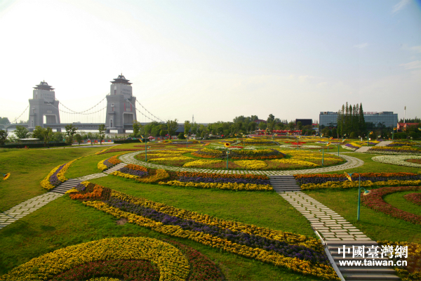 揚(yáng)州市廖家溝馬可波羅花世界的花海以及不遠(yuǎn)處的萬(wàn)福大橋。(中國(guó)臺(tái)灣網(wǎng) 王鑫 攝)