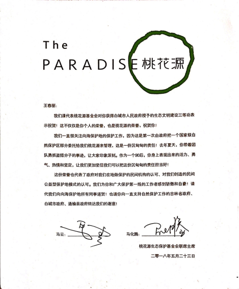 “我們一直很關注向海保護地的保護工作,因為這是第一次由政府把一個國家級自然保護區部分委托給我們桃花源來管理,這是一份沉甸甸的責任!”信中寫道,“這份榮譽也代表了政府對我們在地做保護的民間機構的認可,對我們創造的民間公益型保護地模式的認可!