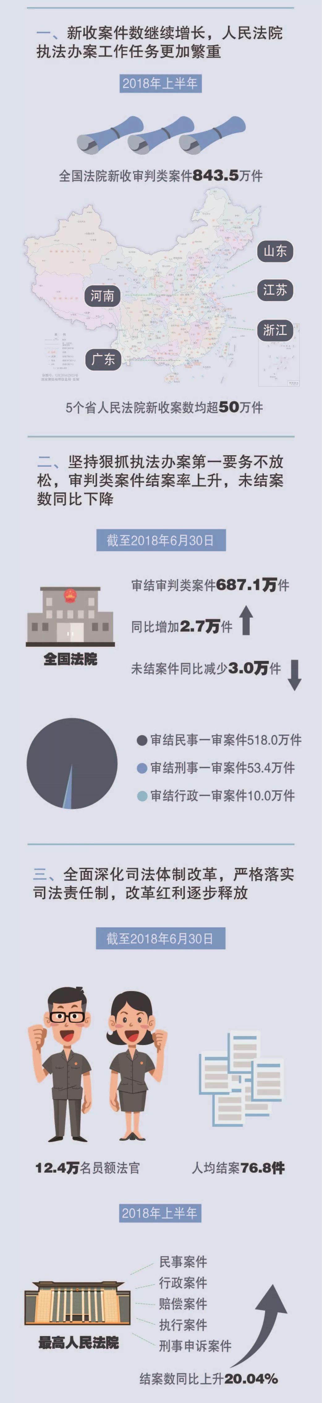 最高人民法院審判管理辦公室主任李亮介紹,2018年上半年,全國法院新收審判類案件843.5萬件,其中,河南、廣東、江蘇、山東、浙江5個省人民法院新收案數均超50萬件,15個人民法院(北京市西城區人民法院、海淀區人民法院、朝陽區人民法院、豐臺區人民法院、通州區人民法院;天津市濱海新區人民法院;上海市靜安區人民法院、閔行區人民法院、浦東新區人民法院;廣東省廣州市越秀區人民法院、深圳市中級人民法院、深圳市福田區人民法院、深圳市寶安區人民法院、東莞市第一人民法院;四川省成都市中級人民法院)新收案數超過2萬件,另有83個人民法院新收案數超過1萬件。