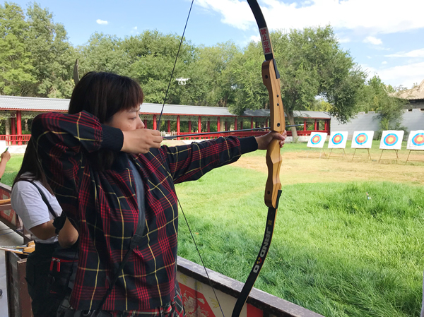 游人在錫伯古城體驗(yàn)射箭 新華網(wǎng) 周欣攝
