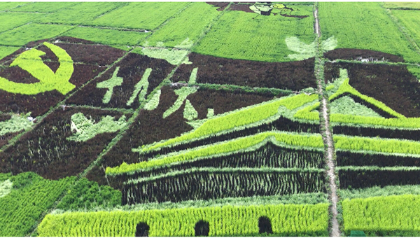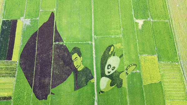 在察布查爾縣納達(dá)齊牛錄鄉(xiāng),有一片總占地面積600多畝的稻田畫(huà),游人們站在27米的觀(guān)光塔上,可以清晰地看到“戰(zhàn)狼2”“功夫熊貓”“米老鼠唐老鴨”等彩稻組成的圖案。這個(gè)名叫“綠夢(mèng)飛揚(yáng)”的稻田畫(huà)基地始建于2015年,水稻品種均引自沈陽(yáng)市沈北新區(qū)彩色水稻系列。