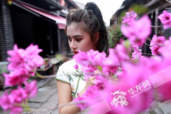 穿著旗袍的美女與古樸的巷道嬌艷的花朵相得益彰。記者 謝鵬 攝