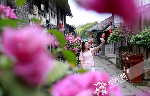 古色古香的巷道,開(kāi)滿(mǎn)了紅色的花朵,引得游客不禁自拍留念。記者 謝鵬 攝