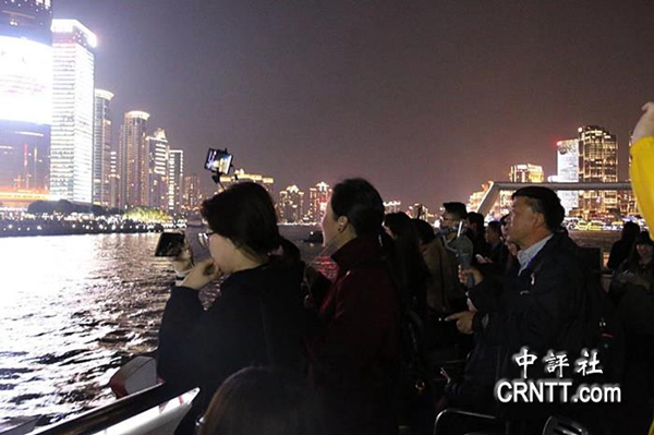 兩岸記者運用新媒體技術轉播外灘夜景。(圖片來源:中評社)