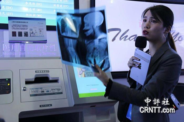 講解員演示醫用自助取片機。(圖片來源:中評社)