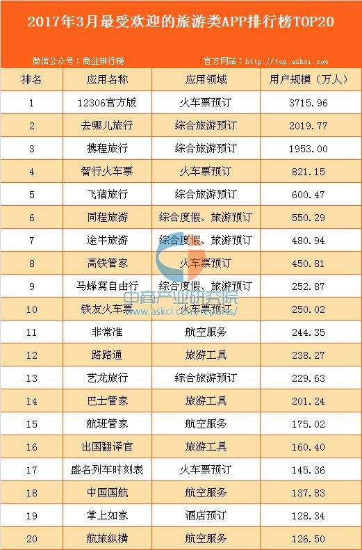 2017年最受歡迎的旅游APP排行榜資料圖 (來源:中商情報網)
