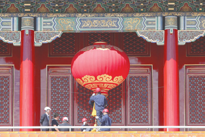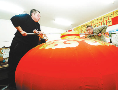 準備使用前,兩名工人壓開燈籠。本報記者賀勇攝。