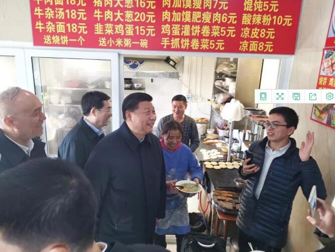 返回途中,習近平臨時下車,走進一家路邊小餐館,同店主和顧客熱情交流,了解生意怎么樣、食材哪里來、味道好不好,并祝他們生意興隆。