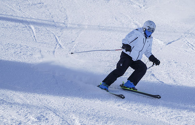 ↑2月8日,一位滑雪愛好者在絲綢之路國際滑雪場一處高級雪道上滑雪。