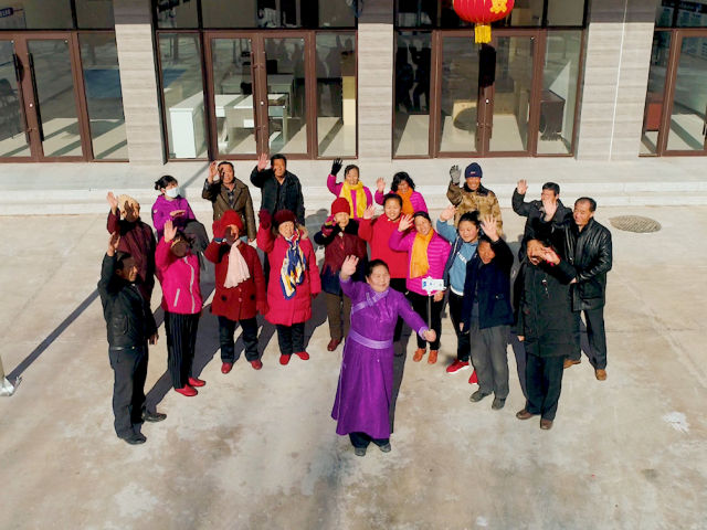 趙會杰和小廟子村村民站在村黨群活動中心前,一起自拍錄視頻。新華社發(視頻截圖)