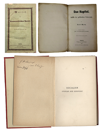 上圖為1848年《共產(chǎn)黨宣言》德文第一版。右上圖為1867年《資本論》德文第1卷第一版。下圖為恩格斯的題字贈書《社會主義從空想到科學(xué)的發(fā)展》,1892年英文版。 中央黨史和文獻研究院供圖
