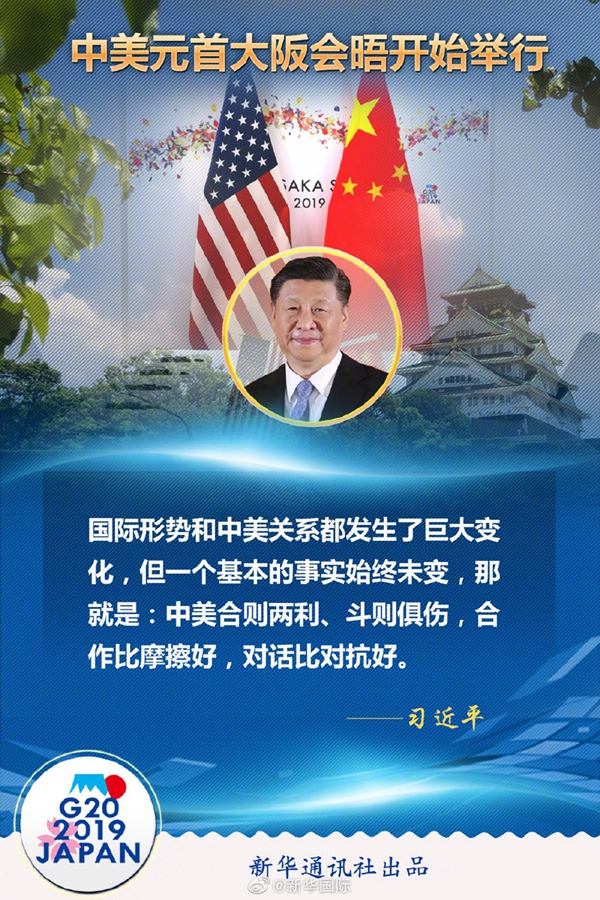 習近平在會晤開始時說,很高興同總統先生在大阪見面。48年前,也就是1971年,就在離這里100多公里的名古屋,參加第三十一屆世界乒乓球錦標賽的中美乒乓球運動員進行了友好互動,這就是后來人們說的“乒乓外交”的開啟,創造了“小球轉動大球”的歷史佳話。8年之后的1979年,中美建立了外交關系。回顧建交以來的40年,國際形勢和中美關系都發生了巨大變化,但一個基本的事實始終未變,那就是:中美合則兩利、斗則俱傷,合作比摩擦好,對話比對抗好。近來,我同總統先生通過電話和書信保持著密切聯系。今天,我愿同總統先生就事關中美關系發展的根本性問題交換意見,為下階段兩國關系發展定向把舵,推進以協調、合作、穩定為基調的中美關系。