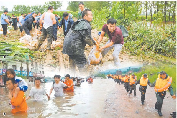 圖①:棗莊干群攜手在嶧城底閣鎮(zhèn)母子河搶險堵塞堤壩決口。□張環(huán)澤 趙峰 報道