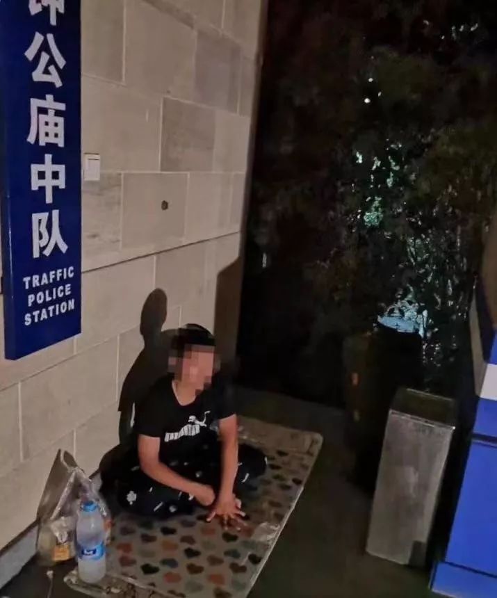 8月7日晚10點左右,寧波鄞州鐘公廟交警中隊的輔警胡豪杰在單位加完班開車回家。當車子駛出大門時,他依稀看到一個人影。湊近查看后,他發現一個小伙兒躺在門口,身下墊著毯子,一旁還放著行李箱、背包。
