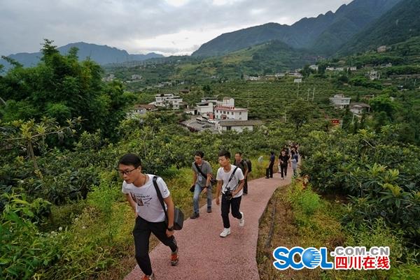 中午時分,采訪團記者一下車,就被眼前的果樹林所震撼:青翠的果樹沿大渡河岸一線撒開,一眼望不到邊。“黃果柑掛果要一年,明年3月才會成熟。”挖角鄉鄉長山丹梅說,這里已發展黃果柑600畝,是石棉縣“百里金果長廊”鄉村旅游帶重要組成部分,也是產村互動共融的新農村示范點。