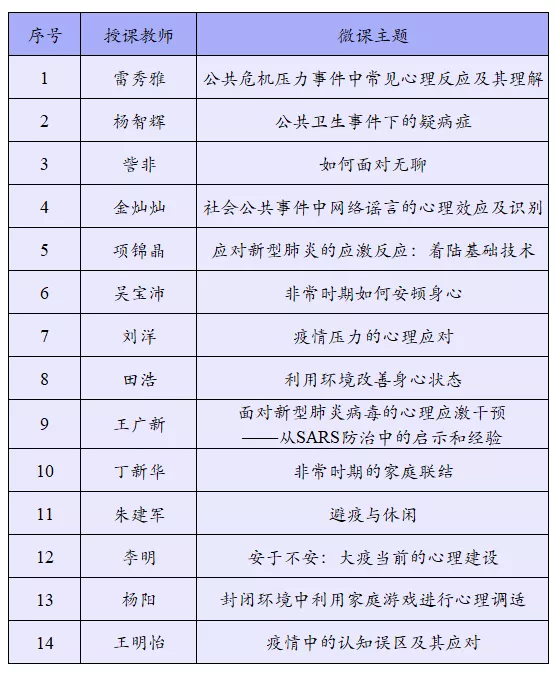 目前已確定的微課講座共計14講,均由北京林業大學心理系教師講授,包括:應對類和相關知識類等,詳情請見下表(后期還會持續增加新的講座主題,敬請關注)。