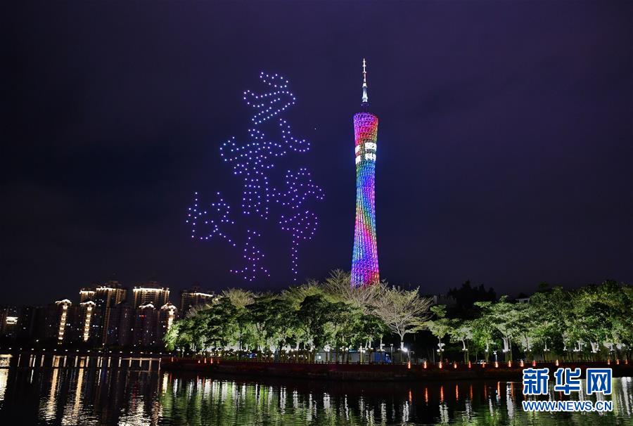 2月9日凌晨,廣州珠江上空的無人機編隊組成廣州塔和黃鶴樓圖形。 當日凌晨,無人機編隊在廣州珠江上空拼出“抗擊疫情”“武漢加油”“元宵節快樂”字樣以及廣州塔和黃鶴樓圖形等,為武漢加油。 新華社記者 劉大偉 攝