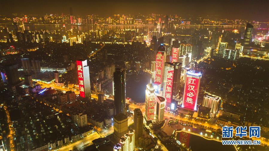 1月31日,武漢市江漢區西北湖附近高層建筑外墻打出“武漢加油”等字樣(無人機照片)。 新華社記者肖藝九攝