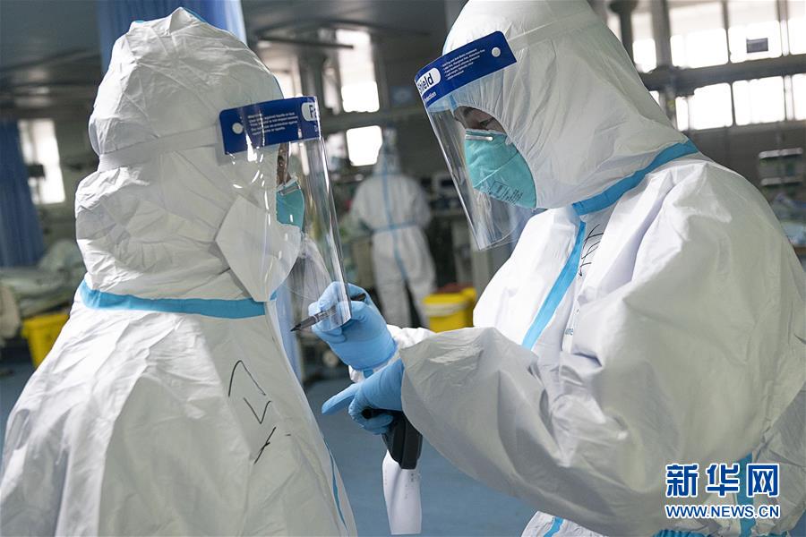 1月24日,在武漢大學中南醫院重癥隔離病房,醫護人員在隔離服上寫下名字,方便辨認。 新華社記者熊琦攝