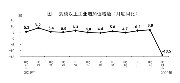 1-2月份,規(guī)模以上工業(yè)增加值同比下降13.5%。分經(jīng)濟(jì)類型看,國有控股企業(yè)增加值下降7.9%;股份制企業(yè)下降14.2%,外商及港澳臺(tái)商投資企業(yè)下降21.4%;私營企業(yè)下降20.2%。分三大門類看,采礦業(yè)增加值下降6.5%,制造業(yè)下降15.7%,電力、熱力、燃?xì)饧八a(chǎn)和供應(yīng)業(yè)下降7.1%。從產(chǎn)品產(chǎn)量看,醫(yī)療防護(hù)和生活所需物資增長較快,口罩、發(fā)酵酒精產(chǎn)量分別增長127.5%和15.6%,凍肉和方便面分別增長13.5%和11.4%。高技術(shù)產(chǎn)品增勢良好,智能手表、智能手環(huán)、半導(dǎo)體分立器件和集成電路產(chǎn)量分別增長119.7%、45.1%、31.4%和8.5%。基本原材料生產(chǎn)平穩(wěn),生鐵、粗鋼、平板玻璃、十種有色金屬產(chǎn)量分別增長3.1%、3.1%、2.3%和2.2%。全國采購經(jīng)理調(diào)查數(shù)據(jù)結(jié)果顯示,截至2月25日,大中型制造業(yè)企業(yè)復(fù)工率達(dá)到85.6%,生產(chǎn)經(jīng)營活動(dòng)正有序恢復(fù)。