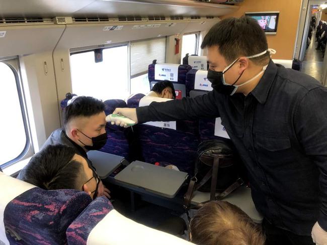 列車上依次測量體溫。宣方均 攝