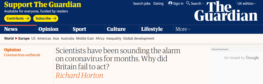《柳葉刀》的主編理查德·霍頓18日在《衛(wèi)報》發(fā)表文章,感激中國科學家預警,痛批英國錯失控制新冠肺炎疫情的良機。他說,疫情發(fā)生后,中國科學家1月24日報告了第一例新冠肺炎病亡案例,并警示了疫情的嚴重性。然而英國忽視了這些信號,浪費了寶貴的時間,也失去了控制疫情的最佳時機。