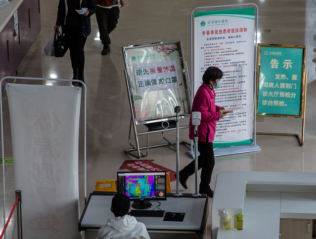 3月19日,武漢協和醫院內門診樓出入口,仍設有體溫檢測處,使用紅外測溫儀監測出入患者的體溫。提醒有發熱癥狀的患者前往發熱門診的提示隨處可見。中青報·中青網記者 李崢苨/攝