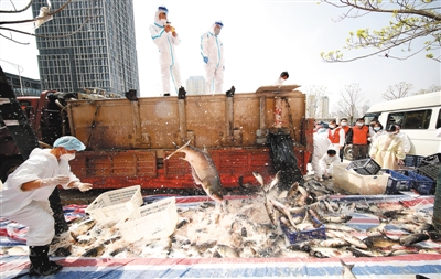 3月19日,湖北武漢,由咸寧調配運送的173.8噸活魚,分別到達漢陽、武昌等指定區域。