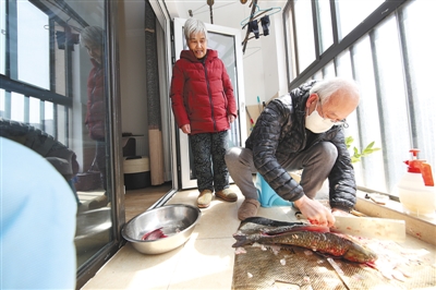 3月19日,武漢市漢陽區四新街道梅林都匯社區,兩位老人正在家中打理社區志愿者們剛剛送來的活草魚。老人說,疫情發生后,老兩口一直隔離在家,生活上很多小事情都是社區幫著解決,日子過得很平穩,身體也很好,請大家放心。