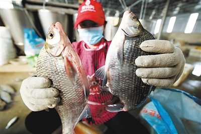 3月17日,武漢市東西湖區東山街道群力村,工人在武漢錦軍水產專業合作社內分裝活鮮武昌魚。