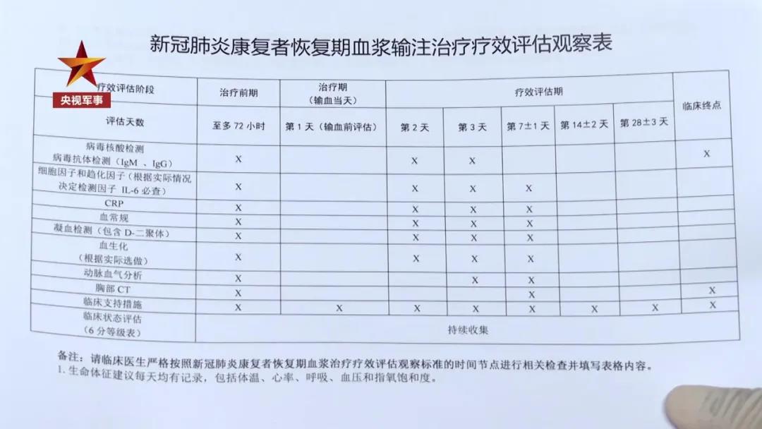 為了對療效進行評估,患者在輸注恢復期血漿后,醫護人員還會按照《療效評估觀察表》嚴密監測相關指標,包括一般生命體征、氧合改善情況、病毒抗體等,并及時記錄。