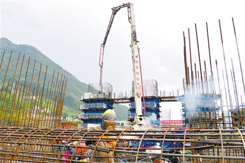 3月26日,工人正抓緊澆筑鄭萬高鐵湖北興山段古夫特大橋橋墩。鄭萬高鐵是“八縱八橫”高速鐵路網的重要組成部分,興山段現到崗人員1700多人,到崗率90%。鄒遠景攝(中經視覺)