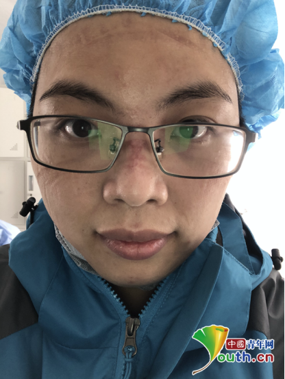 脫下厚重的防護設(shè)備后,黃春芬的臉頰、額頭滿是壓痕。受訪者供圖