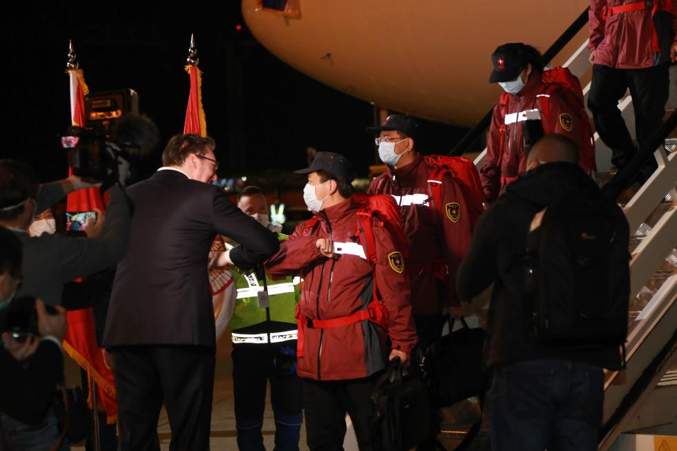 3月21日晚,夜幕中的貝爾格萊德國際機場,塞爾維亞總統武契奇親自在舷梯旁迎接中國抗疫醫療專家組和醫療物資。他與中國專家“碰肘”,又深情親吻一旁的五星紅旗。