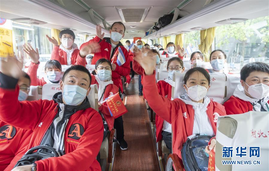 3月31日,在武漢市洪山區駐地,青島大學附屬醫院醫護人員揮手告別。 當日,山東省第七批醫療隊的青島大學附屬醫院132名醫護人員在圓滿完成任務后,離開武漢啟程回家,他們負責武漢同濟醫院光谷院區的一個新冠肺炎重癥病區。 新華社記者 才揚 攝