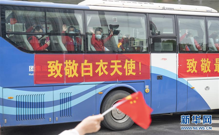 3月31日,在武漢市洪山區駐地,青島大學附屬醫院醫護人員登上大巴準備前往機場。 當日,山東省第七批醫療隊的青島大學附屬醫院132名醫護人員在圓滿完成任務后,離開武漢啟程回家,他們負責武漢同濟醫院光谷院區的一個新冠肺炎重癥病區。 新華社記者 才揚 攝