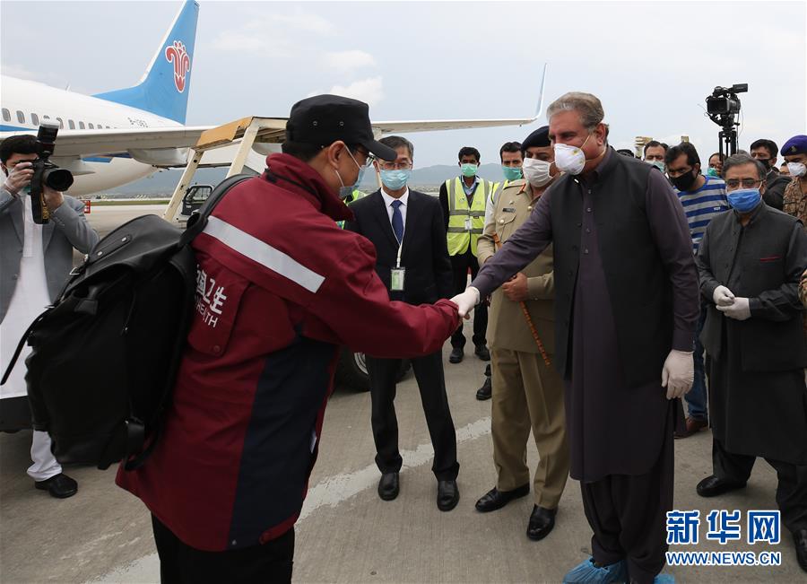 3月28日,在巴基斯坦伊斯蘭堡國際機場,巴基斯坦外長庫雷希(前右)與剛剛抵達的中國政府赴巴基斯坦抗疫醫療專家組成員握手。 新冠肺炎疫情發生以來,習近平主席時刻關注國內外疫情形勢,高度重視抗疫國際合作,多次作出重要指示批示,頻頻開展元首外交,從構建人類命運共同體高度,親自推動疫情防控國際合作。 新華社記者 劉天 攝