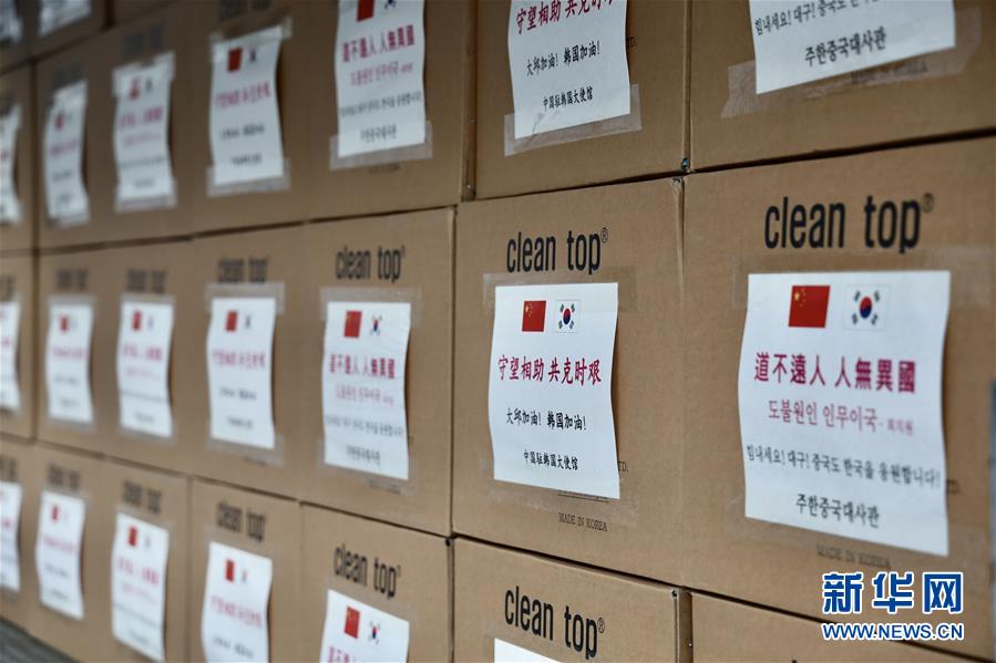 2月27日,在韓國首爾,中國駐韓國大使館緊急籌備的醫用口罩準備運往大邱。箱子外包裝上寫著:“道不遠人 人無異國”“守望相助 共克時艱”等支持的話語。 新冠肺炎疫情發生以來,習近平主席時刻關注國內外疫情形勢,高度重視抗疫國際合作,多次作出重要指示批示,頻頻開展元首外交,從構建人類命運共同體高度,親自推動疫情防控國際合作。 新華社發(中國駐韓國大使館供圖)