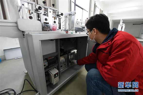 在合肥奧瑞數(shù)控科技有限公司技術(shù)研發(fā)車間,工作人員對新研制的N95口罩機進行最后的調(diào)試(3月12日攝)。新華社發(fā)(周牧 攝)