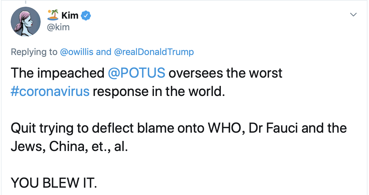 網民:“別再把責任推給世衛組織、福奇博士或中國了。是你把情況搞砸了。”↓↓↓