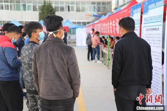 4月中旬,甘肅省臨夏回族自治州康樂縣迎來扶貧專場招聘會。圖為當地民眾在招聘會現場咨詢。 林瑞祥 攝