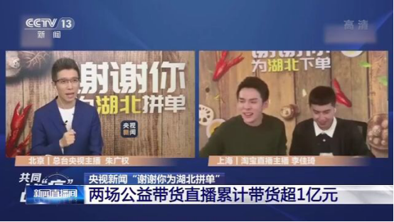 受疫情影響,湖北一些農副產品面臨產銷積壓。央視新聞“謝謝你為湖北拼單”公益行動開播帶貨直播。4月6日與12日的兩場直播,分別賣出價值4014萬元和6100萬元的湖北產品,助力湖北復工復產。